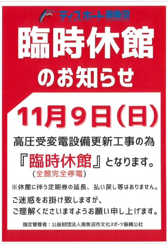 いつも、ディスポート南魚沼をご利用いただきありがとうございます。 11月9日(日) 高圧受変電設備更新工事の為、臨時休館となります。 施設内、完全停電となり電話でのお問合せ等々もできません。ご理解の程よろしくお願いいたします。 なお、翌日10日(月)についても、通常の休館日となります。 (引き続き、工事を行っています)