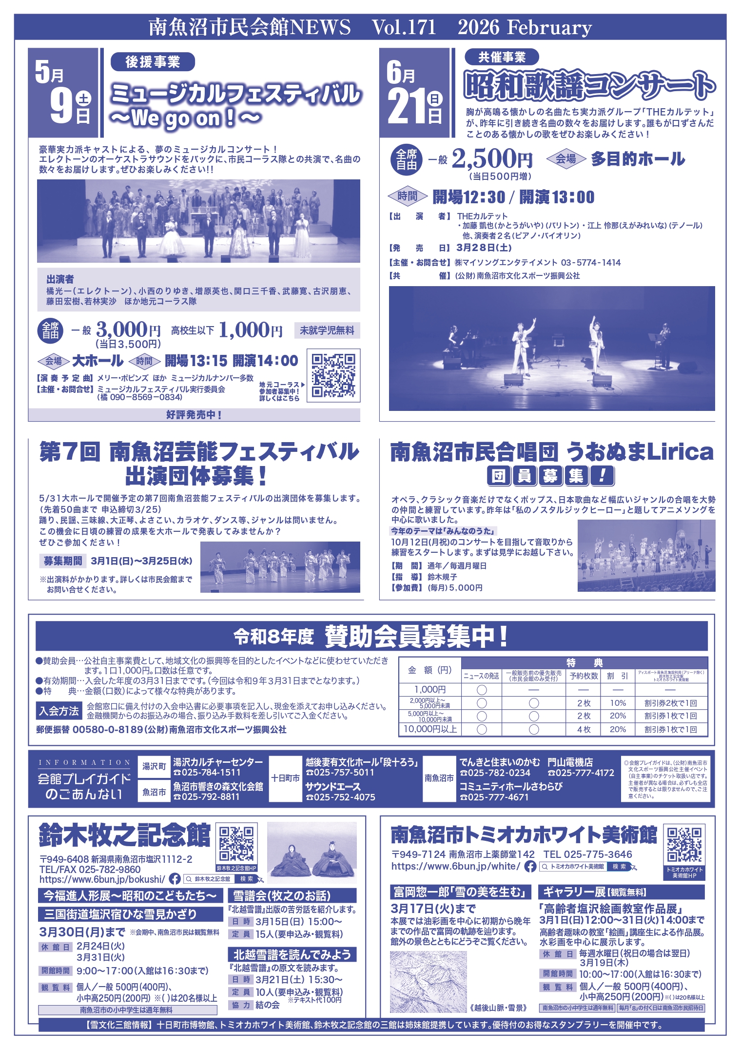 『南魚沼市民会館NEWS vol.171』ご覧になっていただけたでしょうか? 市民会館、鈴木牧之記念館、トミオカホワイト美術館の事業を掲載しています。 ぜひご覧ください!
